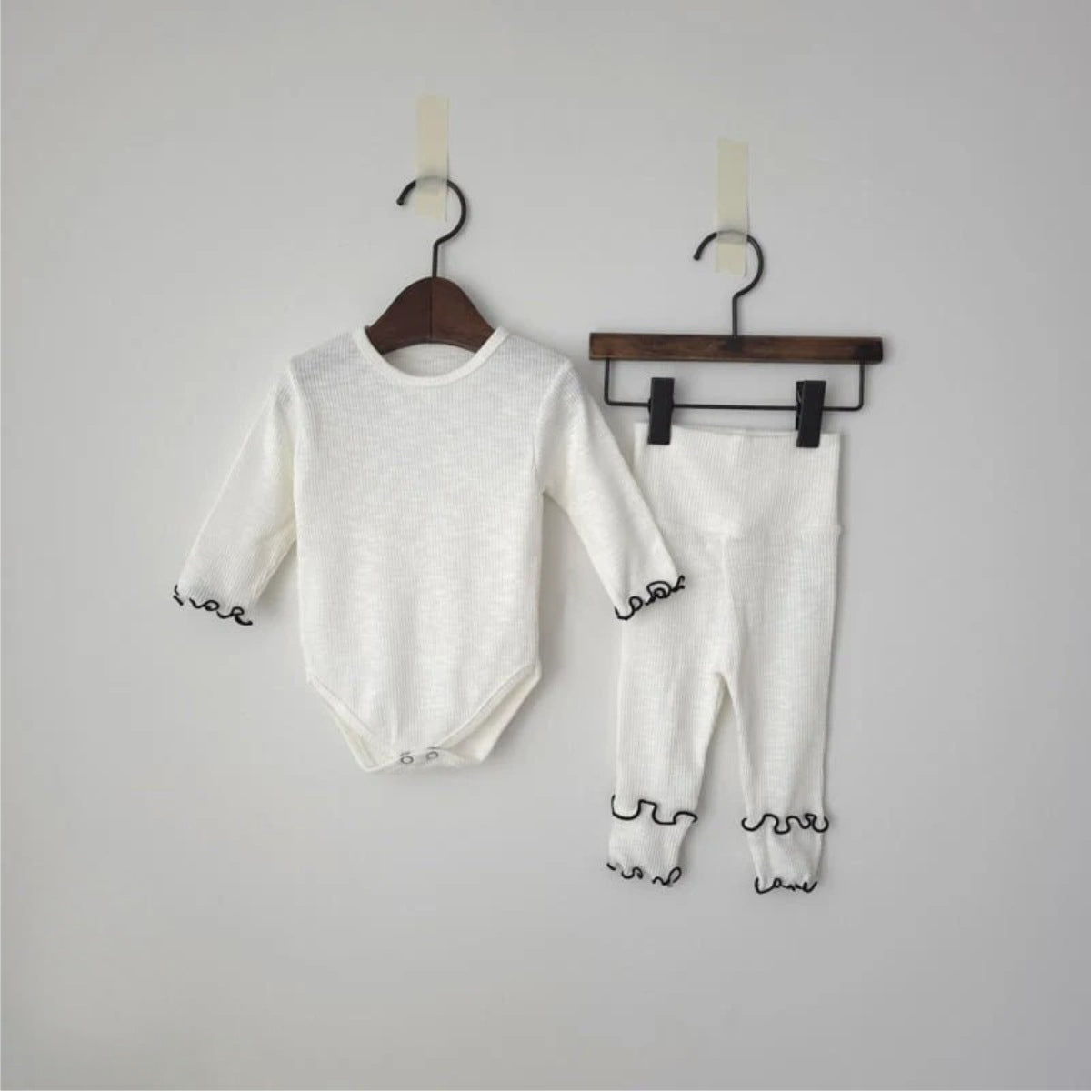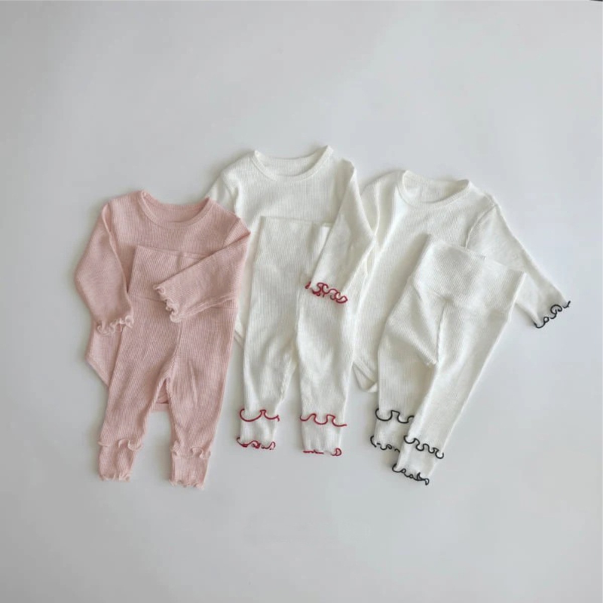 Y8602LS-春季嬰兒彈性坑條波浪捲邊連身衣+高腰護肚緊身褲兩套裝&三件套