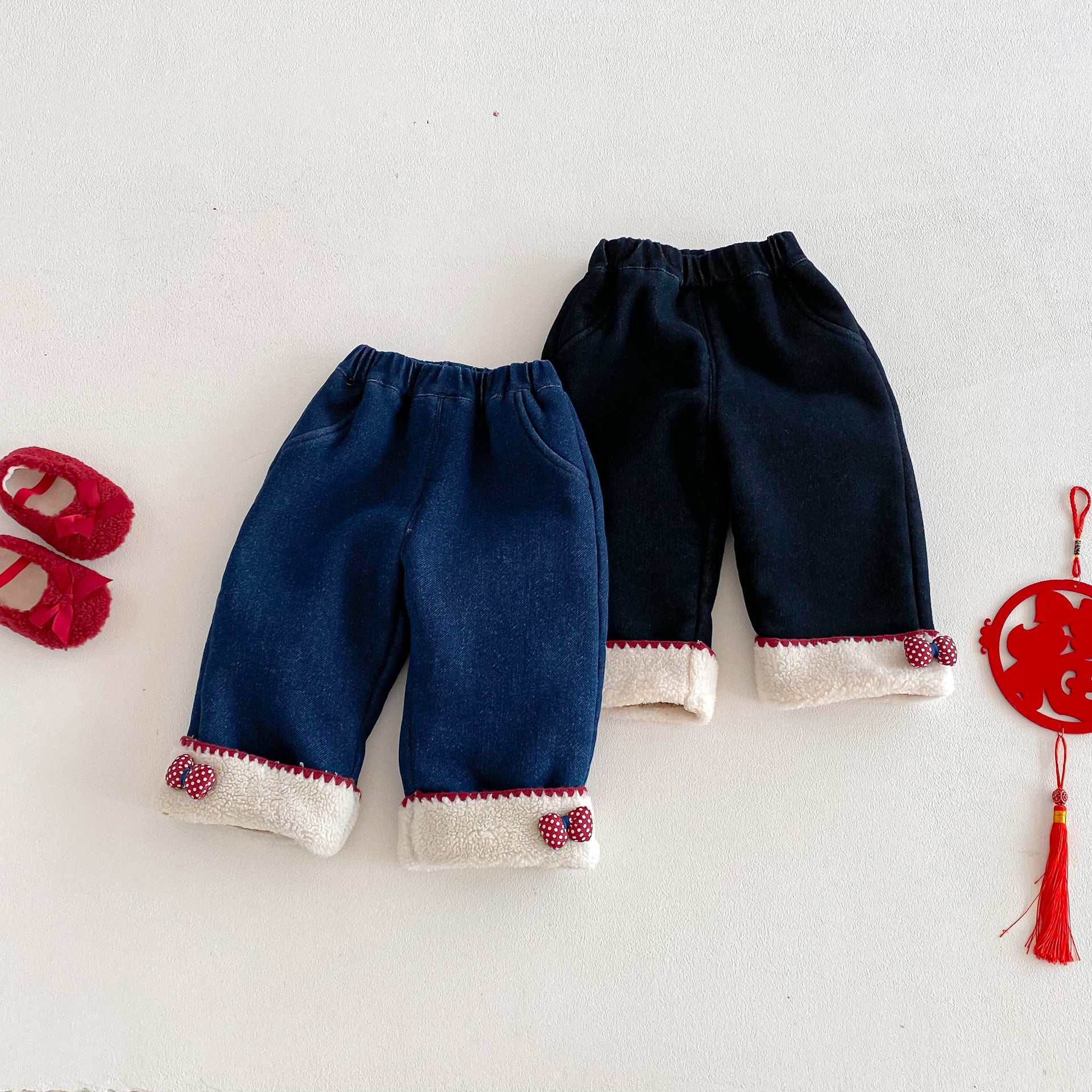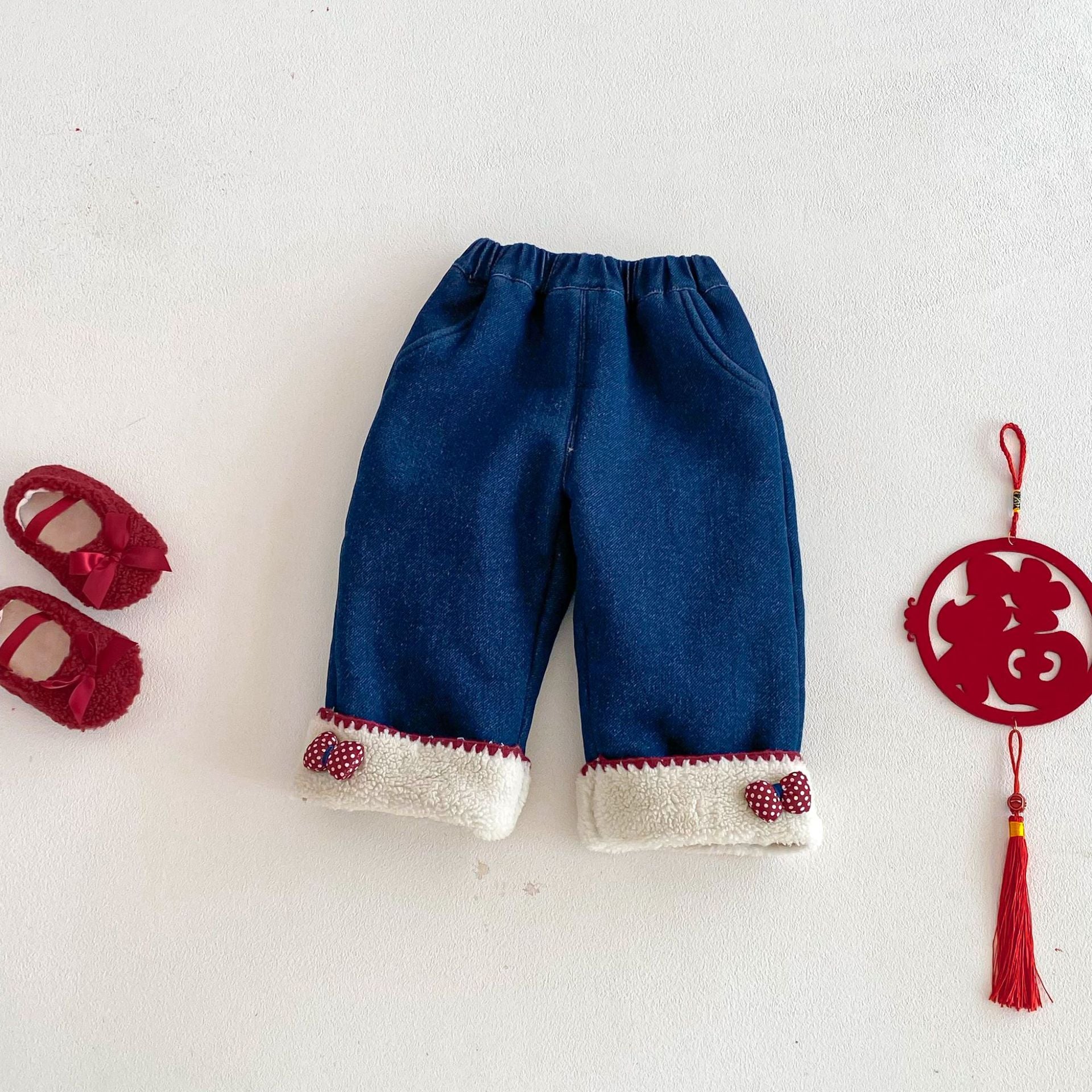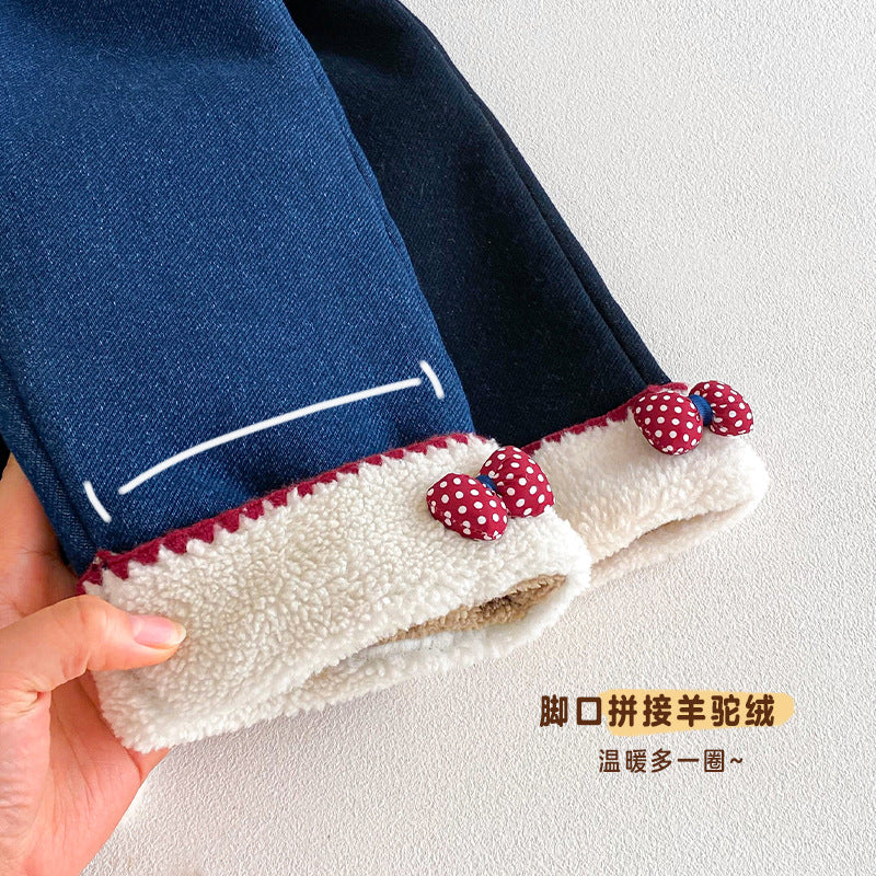 ZDK5708PA-冬季超萌蝴蝶結加絨牛仔長褲